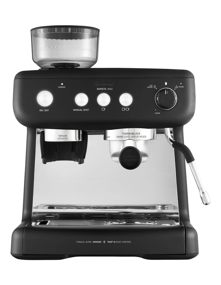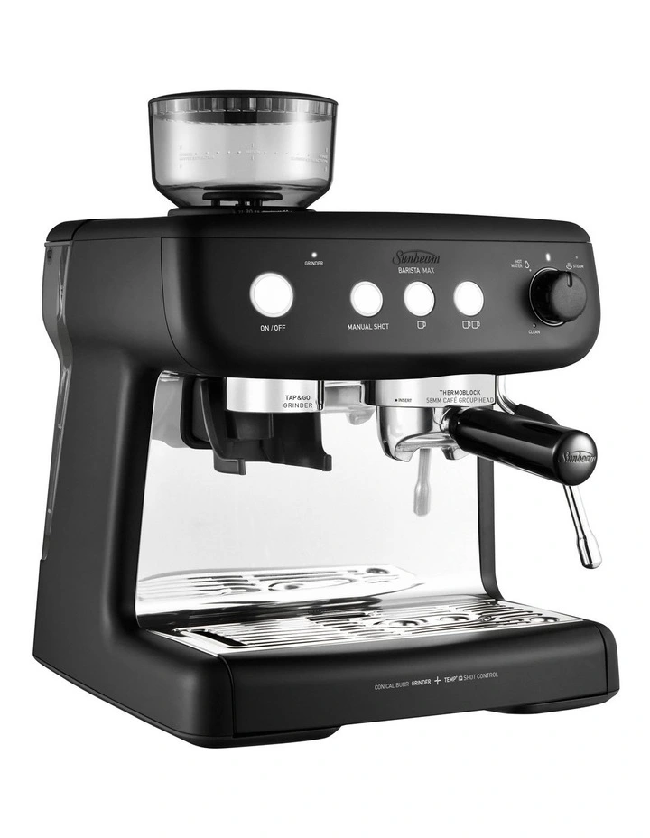 Indulge your love for fresh coffee beans with the Sunbeam Barista Max coffee machine.The built-in conical burr grinder delivers fresh tasting coffee with every pour. The 58mm commercial-sized group head and PID controller, provide the perfect dimensions and temperature control for extracting coffee and creating a rich, balanced flavour. Bring out your inner-barista with the powerful steam wand that creates velvety smooth milk.