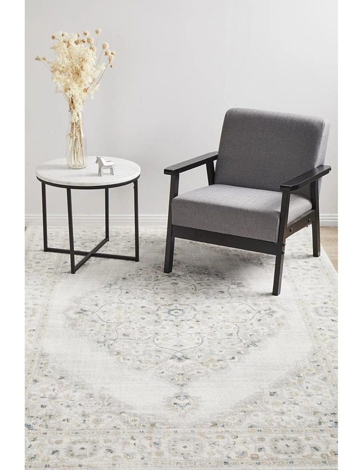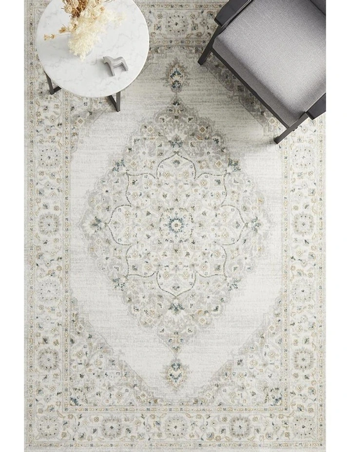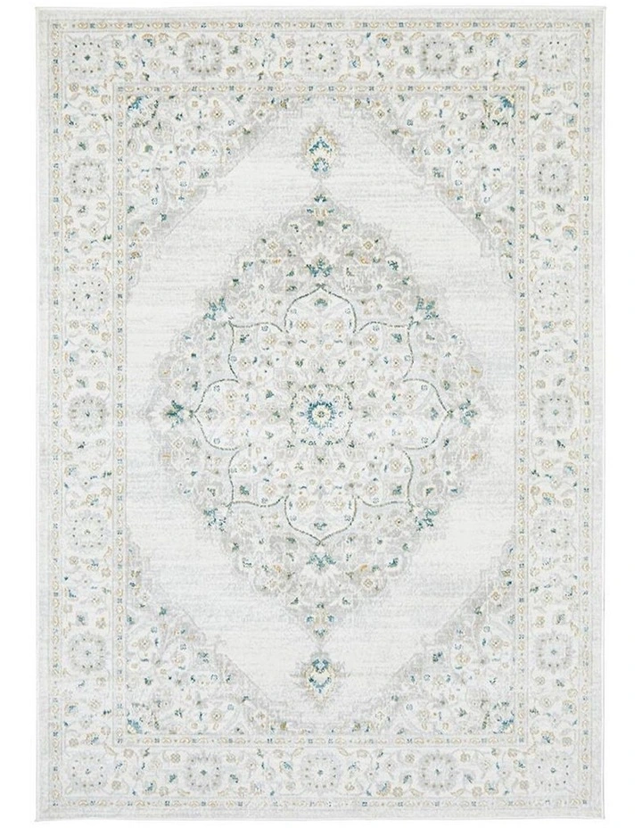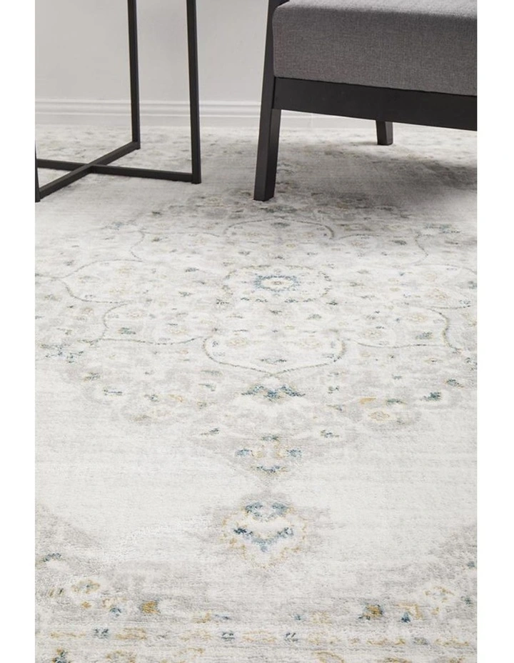 Emotion features a stunning grand diamond medallion centrepiece with ornate patterns that will complement any living space with it’s timeless and elegant style. This vibrant transitional rug features a neutral base of off-white and soft-grey hues that are complimented with subtle pops of golden yellow and luminous teal.