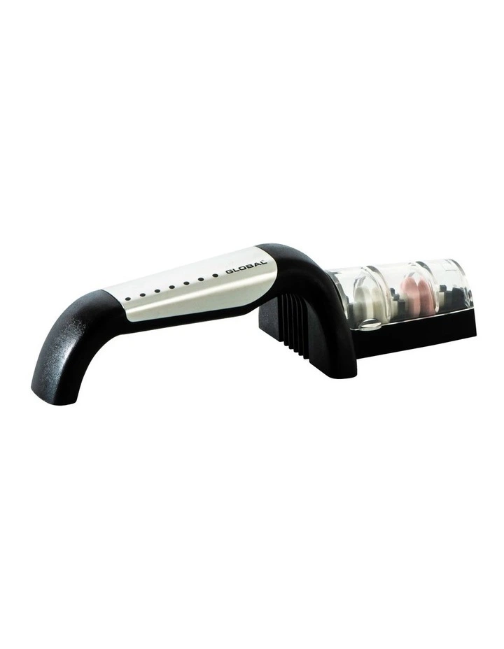 This all-in-one Global 2 Stage Ceramic Water Sharpener features two ceramic wheels, one white and the other pink. The white wheel is course and the pink is fine to ensure an all round sharpened knife. Â