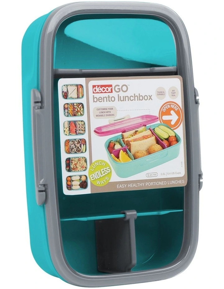 Take lunch on-the-go with the Decor Go Bento Lunchbox. Designed for superior function and style the set includes an extra large base big enough to hold a sandwich, banana, snacks, crackers, juice box and more. Use the two snack compartments with soft peel lid to keep wet foods such as yoghurt, sliced fruit and dip separate so theres no more soggy lunches. With an airtight seal to keep lunch fresh and secure clips the Decor Go XL Lunchbox is the ultimate lunchbox.
