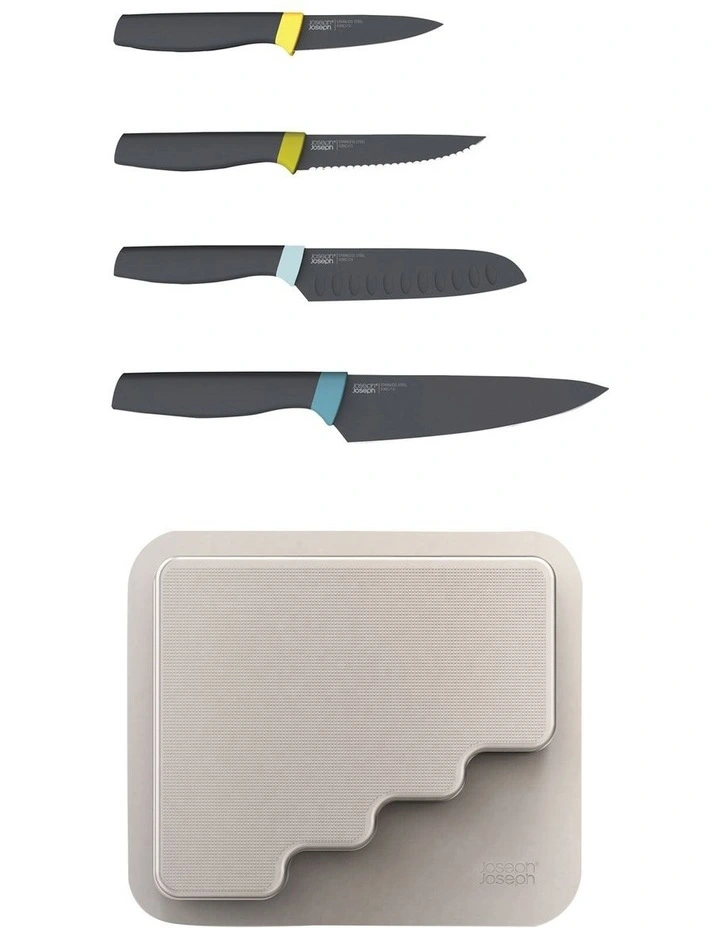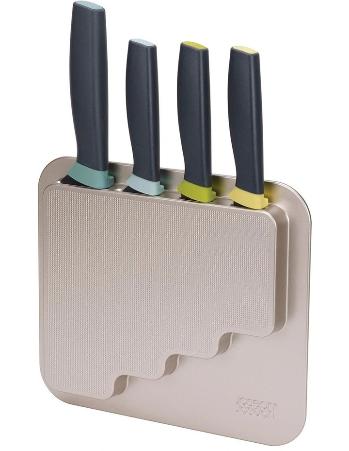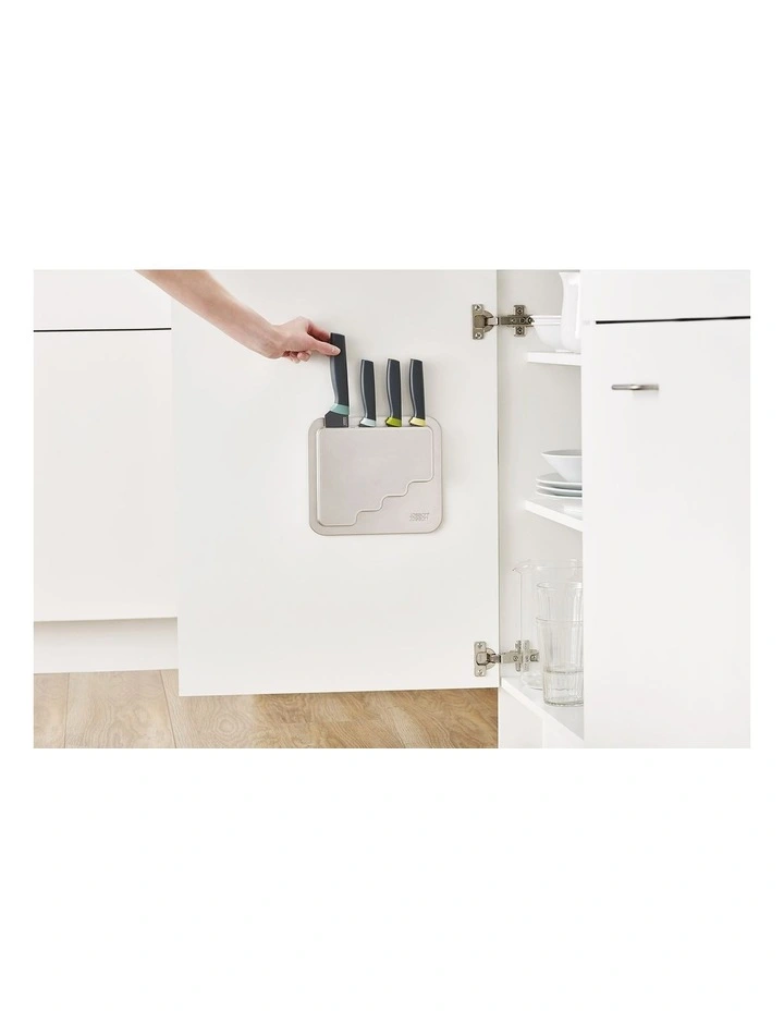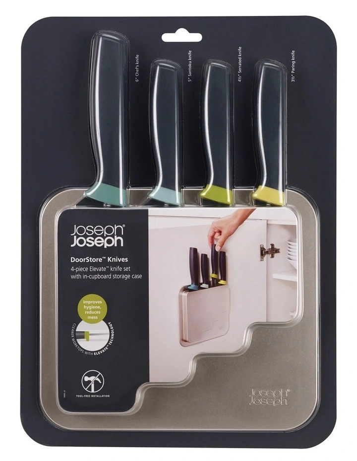 This innovative knife set helps to make maximum use of the space inside your cupboard by storing on the back of the door. It comprises a set of four Elevate knives plus a slimline storage case. The case comes with strong, 3M VHB adhesive tape on the reverse making it very easy to install on a clean, flat surface – ideal for inside cupboards or other narrow spaces. The knives feature silicone-coated, stainless-steel blades and integrated tool rests, which improve hygiene and reduce mess during use. Installation instructions included. Dimensions including knives: 31.1 x 22 x 2.6 cm (12 x 8 x 1 inches)