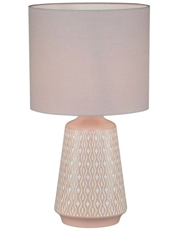 The Moana pink ceramic table lamp comes complete with a pink drum shade. The Moana is a stylish table lamp destined for the bedroom or study. The on/off switch is located conveniently on the cord.