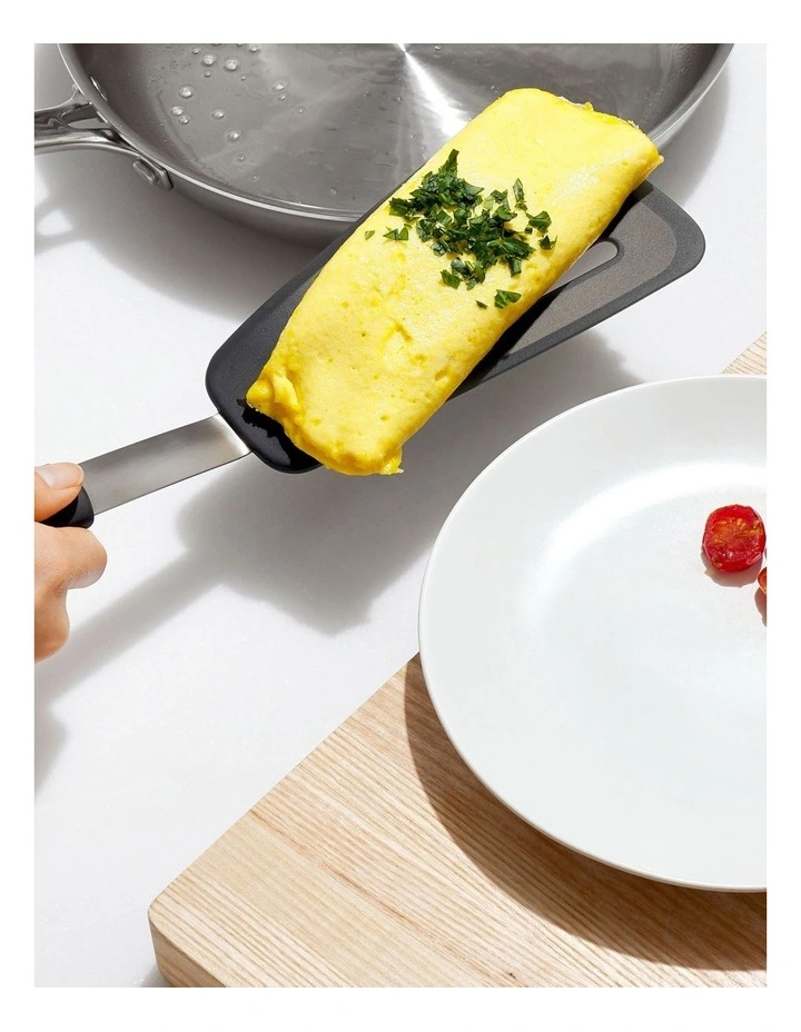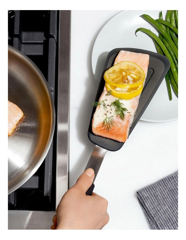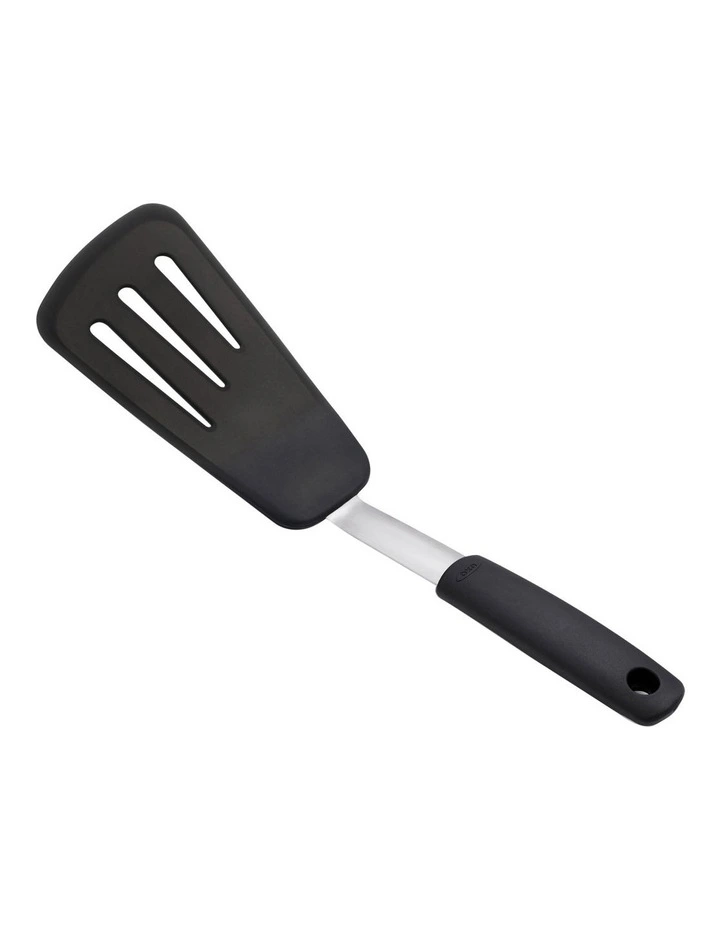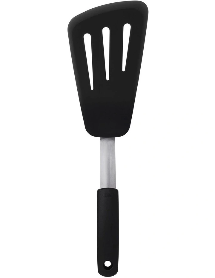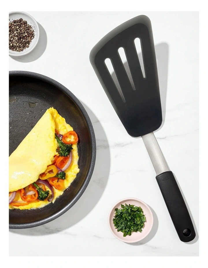 The OXO Good Grips Silicone Flexible Turners combine the strength of stainless steel with the heat resistance and non-stick friendliness of a silicone outer layer. Thin, flexible edges glide under foods in the pan to keep them intact. The Omelet Turner is ideal for flipping longer, delicate foods.