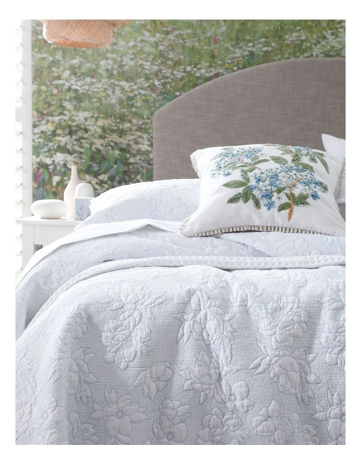 A posy of cotton embroidered flowers in blue across a duck-hued cotton ground, Posy will give any space an elevated, charming feel.Â