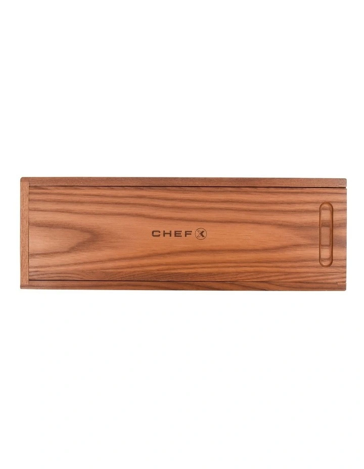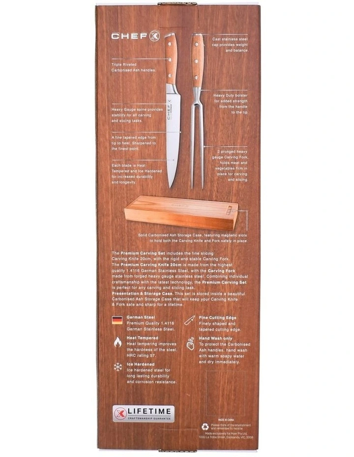 The ChefX Premium Carving Set includes the fine slicing Carving Knife 20cm, with the rigid and stable Carving Fork. The Premium Carving Knife 20cm is made from the highest quality 1.4116 German Stainless Steel with the Carving Fork made from forged heavy gauge stainless steel. Both handles are made using carbonised Ash wood and come complete with a Carbonised Ash storage case.