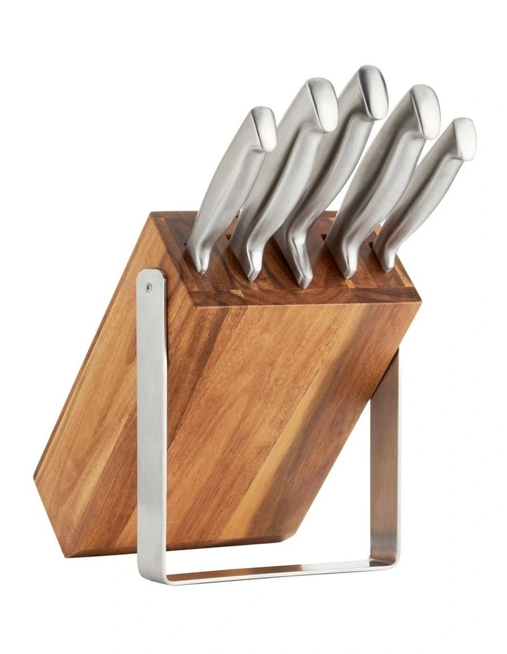 A stylish block designed to store the knives on an angle for easy selection and withdrawal. The block houses the five essential knives to cover all cutting tasks in the kitchen.