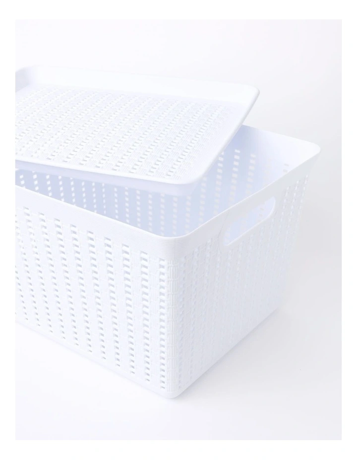 Rattan-Look basket with Lid. Perfect for storing your goods and keeping them tidy. Great for use in the cupboard, under the sink or on the shelf. Can be stacked on top of each other to maximise on space.