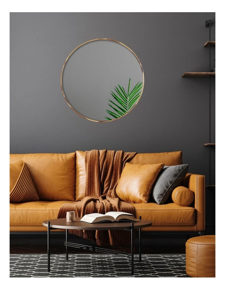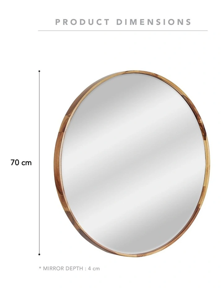 This large 70cm round hanging mirror is the perfect wall piece to create a feeling of depth in any room while enhancing the light from lamps, candles, and windows. Handcrafted from solid acacia wood this piece will last for years to come.