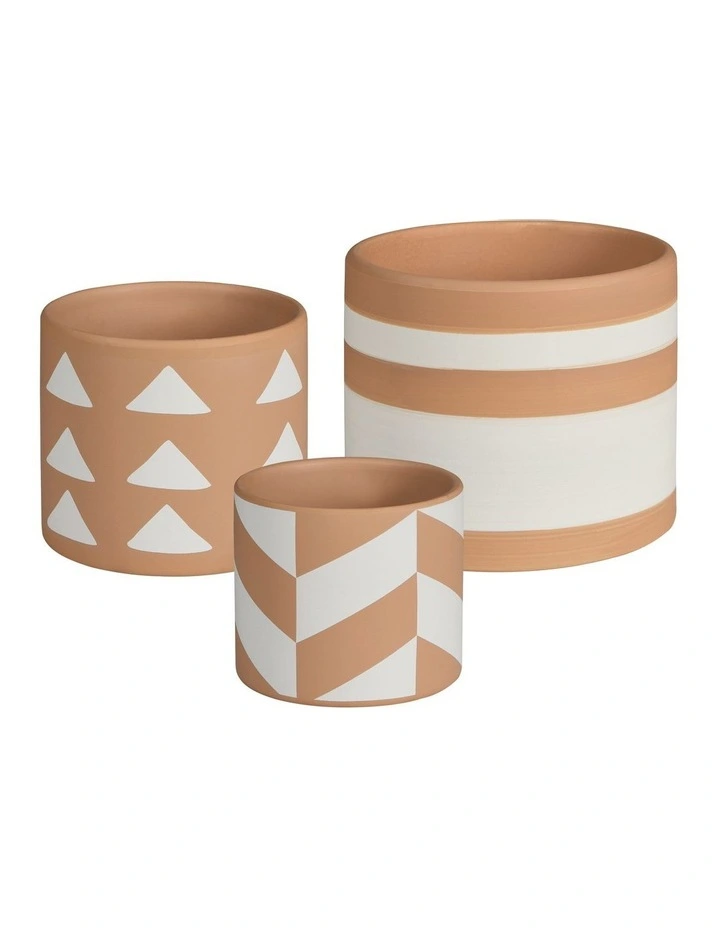 - Set includes three cylindrical pots in varying sizes perfect for placing your favourite.