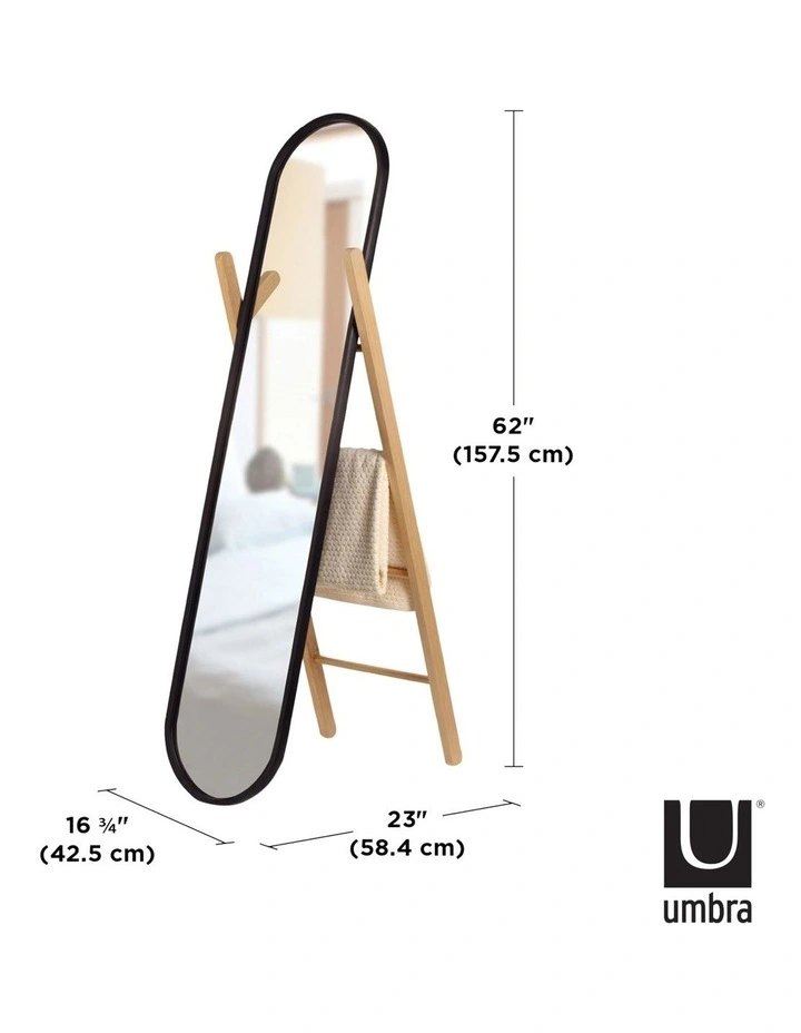 The Hub Floor Mirror is a floor length vanity mirror that doubles as a storage rack to hold clothing, linens, and a variety of accessories. Made of a solid rubberwood easel-backed ladder in a natural finish with a black rubber rimmed mirror, Hub is functional for a variety of spaces, thanks to its compact size and thoughtful design.