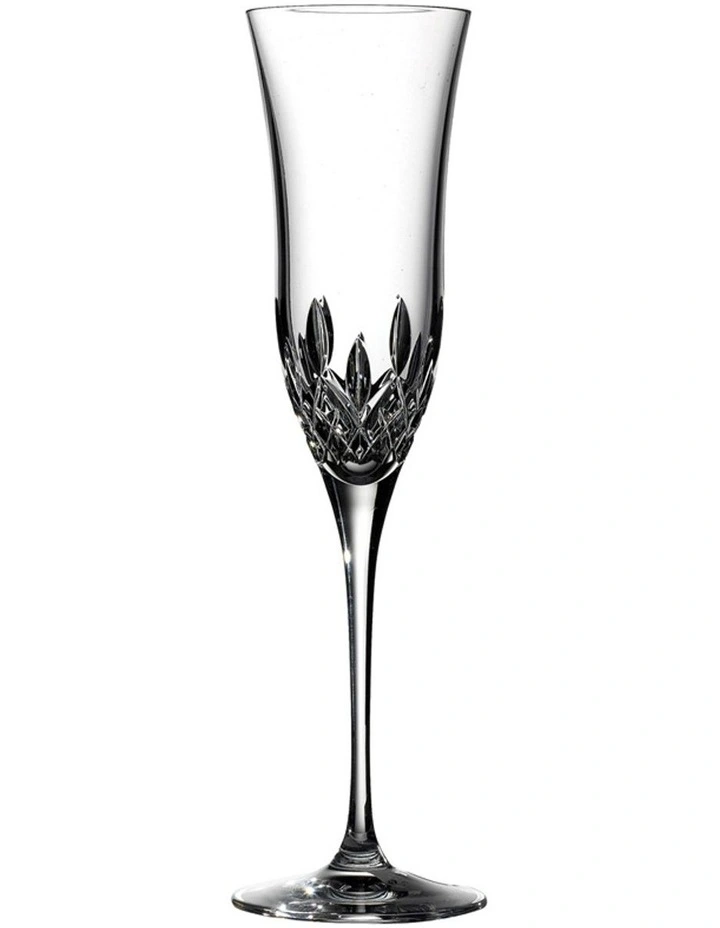 A more modern interpretation of the signature Lismore pattern, Lismore Essence Flute Pair features long stemmed glassware detailed with understated diamond and wedge cuts.