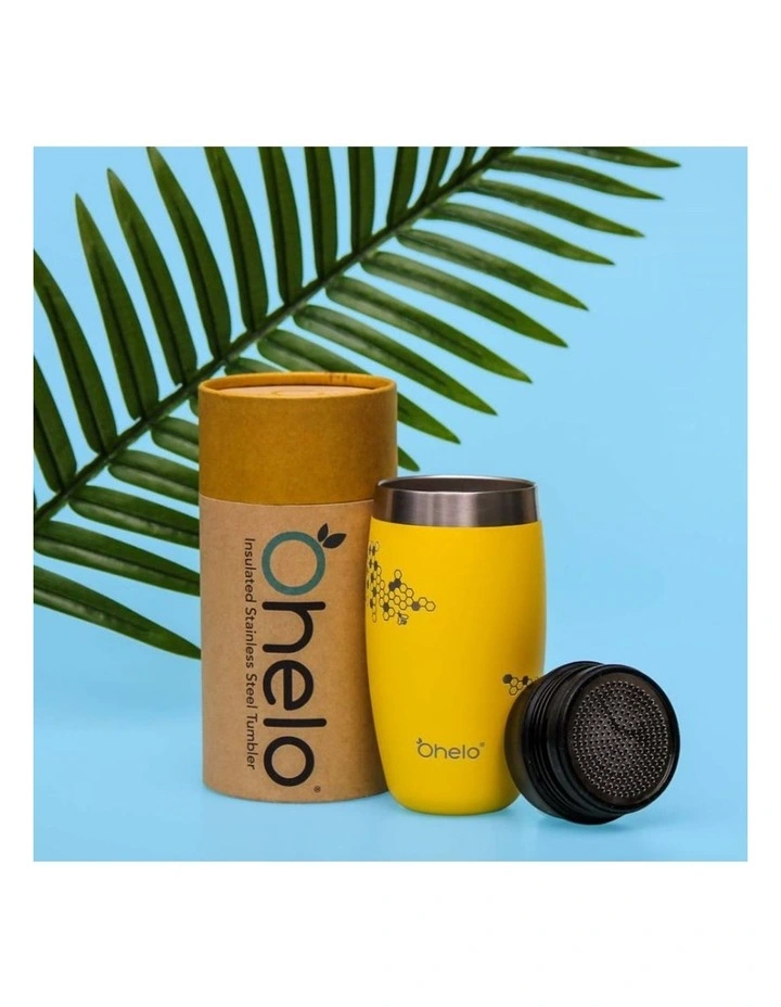 Features:This intricate honeycomb design comes complete with a mini bee.Ohelo helps you fight against single-use plastics and feel fantastic as you are doing it. They focus on creating high-quality bottles and tumblers that are uniquely designed. OHelo’s designs are stylish enough for daily city use and perform when taken on an adventure.So much more than a reusable coffee cup. Our double-walled vacuum insulated tumbler has a stainless steel mesh attachment that lets you quench your thirst with the tipple that best suits your needs.Volume: 400mlVacuum insulated, double walled high grade 18/8 stainless steelHot for up to 6 hours, cold for up to 12 hours100% leakproof lidsDrink from any angle. A simple twist turns it from sip mode to 100% leakproof.Innovative stainless steel mesh attachment has multiple uses: tea strainer, protein shaker, milkshake mixer and many more. Both the mesh and its seal can be removed when not in useCoffee shop compliant just refill and go!BPA, BPS and BPF freeLead-free powder coat for slip-resistant high-end finish360 Bees laser etched artwork that wont fadeLead-free solderInternal thread makes your drinking experience more enjoyable if you remove the lid to use as a coffee cup when you are not on-the-goElectropolished interior provides high resistance to bacteria build-up, increased corrosion-resistance and an easy clean surfaceMouth wide enough for ice cubes OR scoops of protein powderFits most cupholdersReusable and recyclablePackaging that is both recycled and recyclableWe recommend you use hot soapy water to clean your Ohelo product after every use, allowing your Ohelo to drain upside down, and then storing it with the lid off.Colour: YellowMaterial: Stainless SteelMade in: ChinaIncluded: 1x 400ml TumblerWarranty: Products will be replace if faulty or damaged on arrivalDimensions (HxWxD): 18×8.4×8.4 cmWeight: 0.25 kg